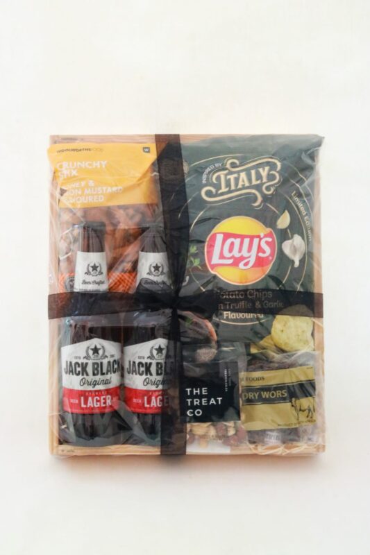 The Artisan Beer Hamper consists of two artisan craft beers and savoury snacks like sliced beef biltong, beef stixs, mixed nuts, Biltong and Cheese Straws, Honey and Mustard Crunchy Stix.