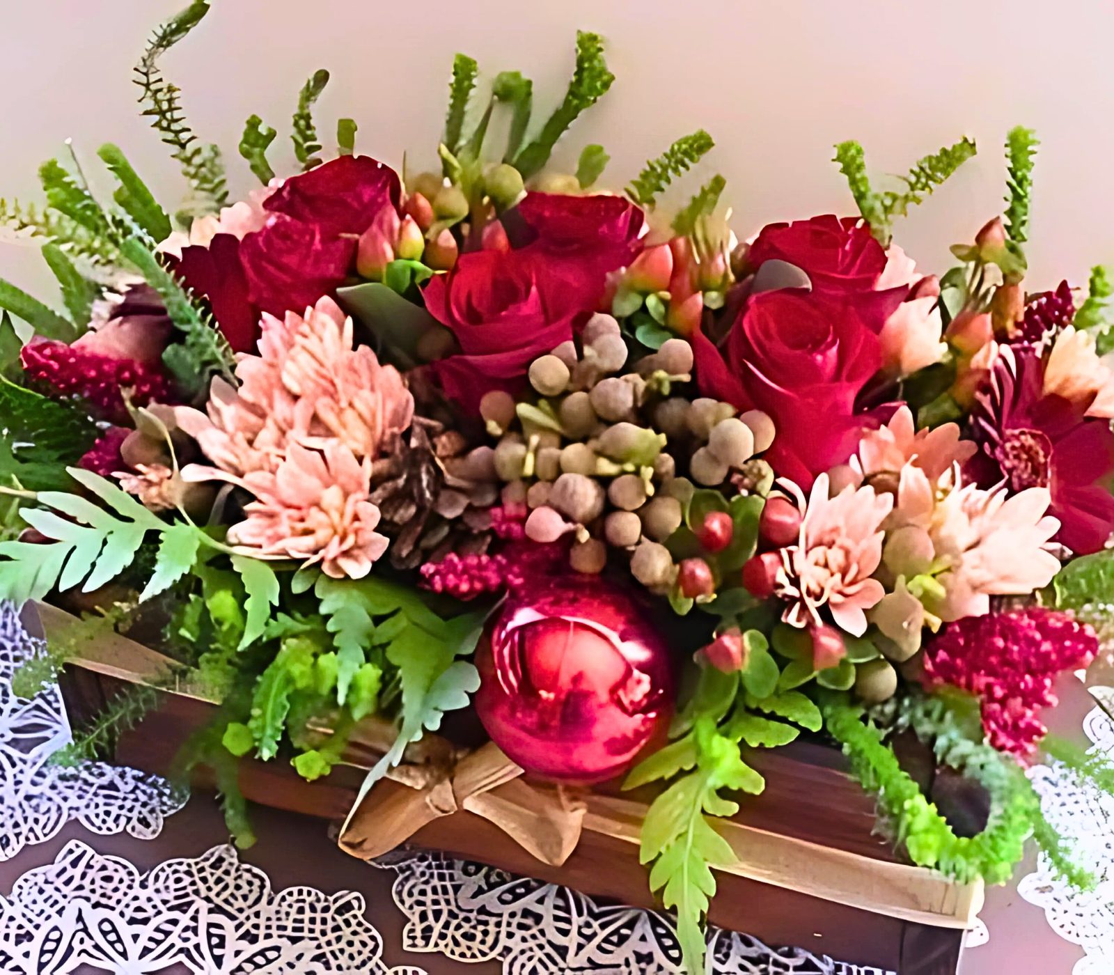 Add a touch of holiday sparkle with this stunning arrangement, featuring vibrant seasonal blooms, lush greenery, and shimmering Christmas baubles. Perfectly designed to bring festive cheer to your home or as a thoughtful gift, this arrangement blends floral elegance with a joyful, decorative flair. Ideal for tabletops, centerpieces, or spreading Christmas magic anywhere!