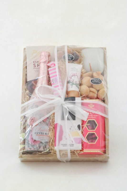 The Pink Blush Hamper is a deluxe hamper filled with delightful sweets and treats, accompanied by a bottle of Annabelle Cuvee Rosé Sparkling Wine and luxury gifts.