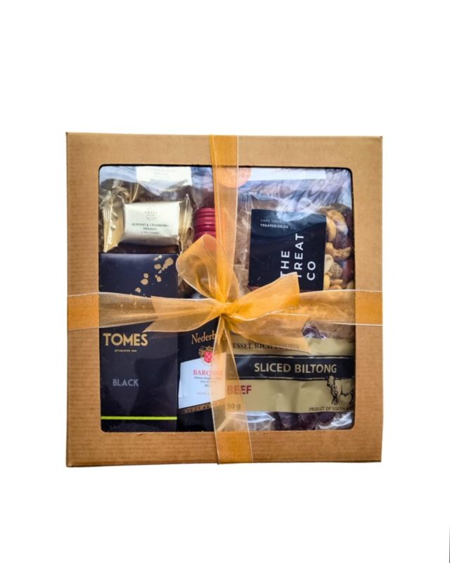 The Wine Snack Hamper contains a Nederburg Baronne red wine with sweet and savoury snacks.